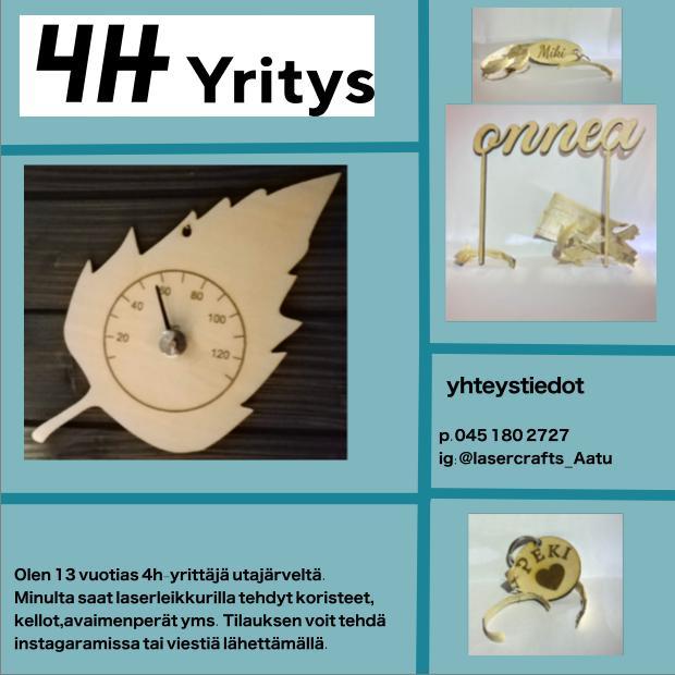 13-vuotias 4H yrittäjä Utajärveltä. Laserleikkurilla tehdyt joulukoristeet, saunamittarit, kellot, avaimenperät yms.