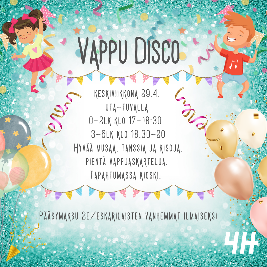 Vappudisco Uta-Tuvalla keskiviikkona 29.4.2026 - 0.-2.lk klo 17-18:30 - 3.-6.lk klo 18:30-20 Luvassa hyvää musaa, tanssia ja pieniä kisailuja. Halukkaille pientä vappuaskartelua. Tapahtumassa palvelee…