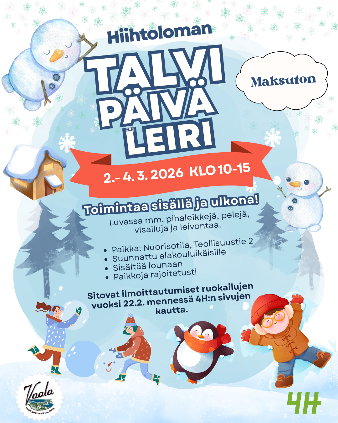 Päiväleiri alakouluikäisille 2.-4.3.2026 klo 10-15.